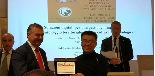 ? 展會(huì)期間安排了多場(chǎng)講座和對(duì)談,中國(guó)專(zhuān)家被邀請(qǐng)做了名為“中意攜手文化遺產(chǎn)保護(hù)利用”的座談。浙江文物考古所劉斌所長(zhǎng)向意大利同行介紹了良渚遺址的考古研究工作,講述了作為新石器文明,良渚與世界上其他同時(shí)期文明的異同。西安建筑科技大學(xué)陜西省古跡遺址工程技術(shù)研究中心主任劉克成教授從建筑遺產(chǎn)保護(hù)的角度回顧了與意大利交流合作的歷程、談到中意面臨的現(xiàn)狀與挑戰(zhàn)及在理念實(shí)踐上的異同。清城?,F(xiàn)部門(mén)主任楊思通過(guò)數(shù)字圓明園等具體案例分享了數(shù)字遺產(chǎn)展示在中國(guó)的發(fā)展階段和應(yīng)用前景。帕埃斯圖姆市長(zhǎng)和展會(huì)主辦方共同向中國(guó)觀察團(tuán)頒發(fā)了一個(gè)特別參會(huì)紀(jì)念牌。
