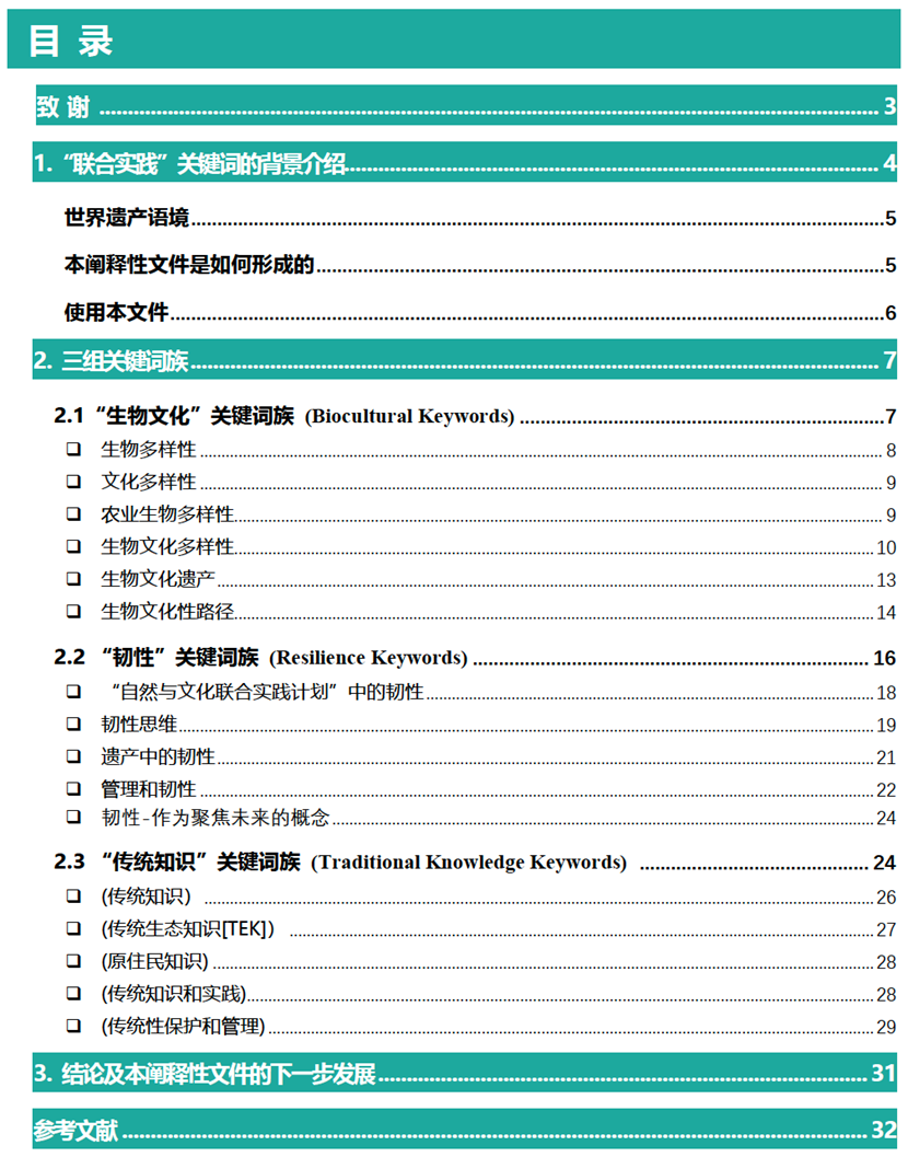2021年國際古跡遺址理事會發(fā)布了《聯(lián)合實踐:關(guān)于‘自然-文化’關(guān)鍵詞的闡釋性文件》。作為2013-2020年間,世界自然保護(hù)聯(lián)盟(IUCN)和國際古跡遺址理事會(ICOMOS)的聯(lián)合探索項目“自然與文化聯(lián)合實踐計劃”的成果之一,該闡釋性文件選擇了與“自然文化關(guān)聯(lián)性(naturecultures)”研究、實踐中最有活力的三組關(guān)鍵詞族,“生物文化”關(guān)鍵詞族 (Biocultural Keywords)、“韌性”關(guān)鍵詞族 (Resilience Keywords)、“傳統(tǒng)知識”關(guān)鍵詞族(Traditional Knowledge Keywords)編撰成冊,供致力于自然和文化聯(lián)合保護(hù)的跨學(xué)科領(lǐng)域遺產(chǎn)從業(yè)者和研究人員使用。