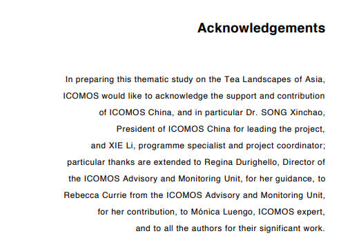 近日,由國際古跡遺址理事會(ICOMOS)主編的《亞洲茶景觀主題研究》在ICOMOS官網(wǎng)正式發(fā)布。中國古跡遺址保護(hù)協(xié)會深度參與了該研究報告的編寫工作。在該報告的致謝中,專門感謝中國古跡遺址保護(hù)協(xié)會(ICOMOS China),尤其是宋新潮理事長對該項(xiàng)目的大力支持和學(xué)術(shù)引領(lǐng)。