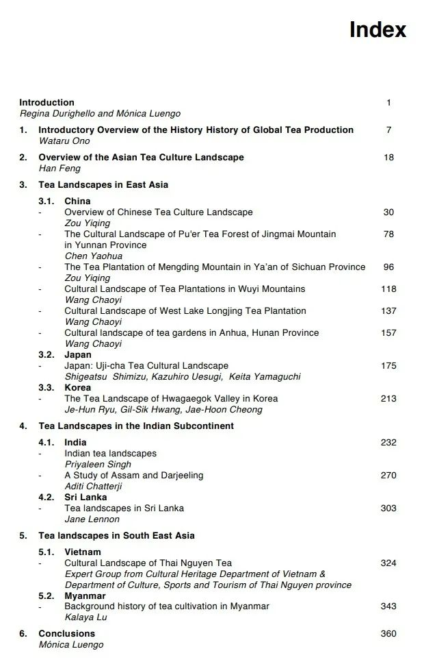協(xié)會副研究員解立作為協(xié)調(diào)人在項(xiàng)目開展全過程扮演了關(guān)鍵角色。ICOMOS文化景觀專委會副主席、同濟(jì)大學(xué)教授韓鋒為本研究報告撰寫了亞洲茶文化景觀的總體介紹,鄒怡情、陳耀華、王超一等專家學(xué)者分別撰寫了中國茶文化景觀概述,以及云南景邁、四川蒙頂山、福建武夷山、浙江龍井、湖南安化等文化景觀的篇章。其他篇章包括日本、韓國、印度、斯里蘭卡、越南、緬甸等國家。中國板塊約占全書的一半。